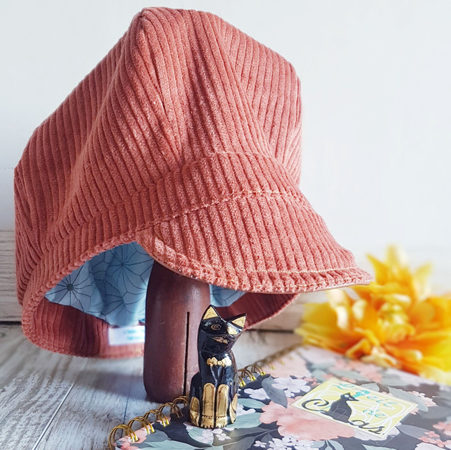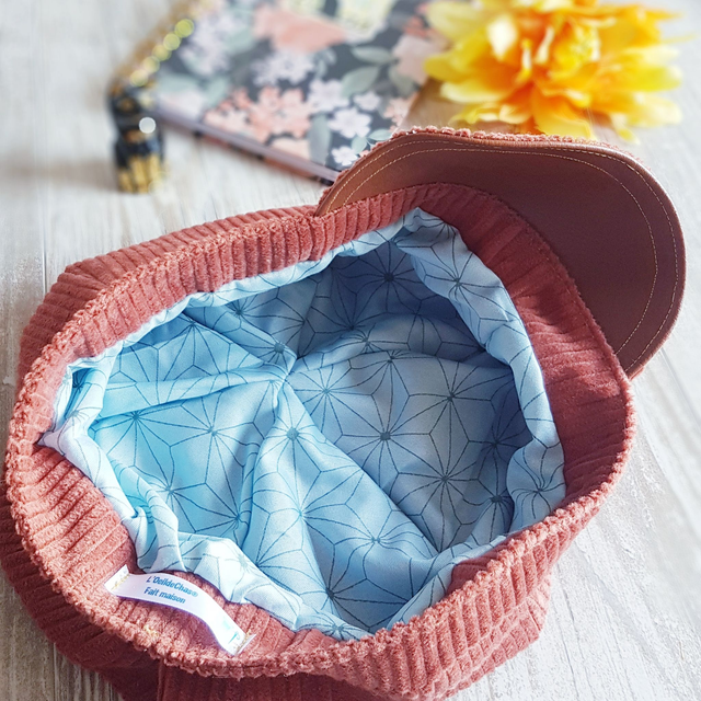 Cette casquette est fabriquée en coton velours couleur corail & doublure micro-fibre OEKO-TEX imprimé géométrie bleu, ultra léger